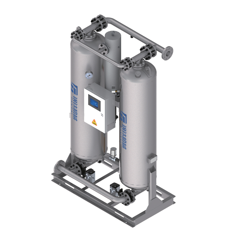 - 壓縮空氣由設備入口經閥門控制進入A塔吸附,得到凈化的壓縮空氣,由排氣截止閥輸出到下游用氣點。另由設備出口引一路干燥的壓縮空氣,經節流閥減壓后加熱至合適的溫度,進入B塔,對B塔進行再生,解析出B塔吸附劑已經吸附的水分。FM型微熱吸附式干燥機結構簡單,性能穩定,可廣泛應用于對節能稍有要求且需求露點比較低、穩定、快速得到干燥壓縮空氣的場景。